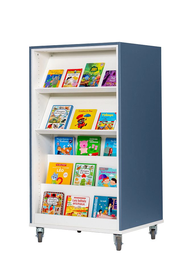 • 3 tablettes droites sur une face, 2 tablettes inclinées + 1 présentoir à livres sur l'autre face